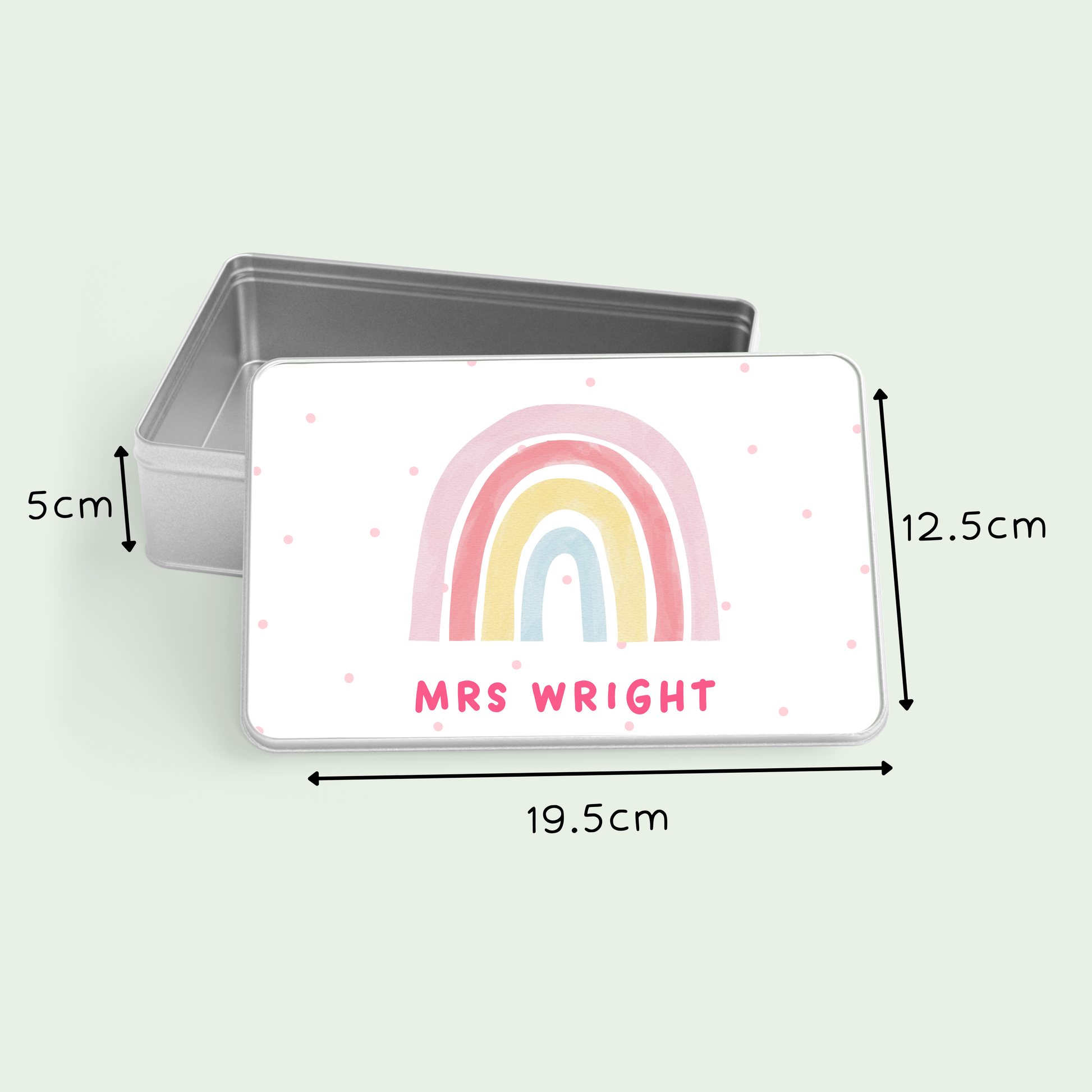Personalised Teacher Tin – Pink Polka Dots & Rainbow Storage Box ✏️